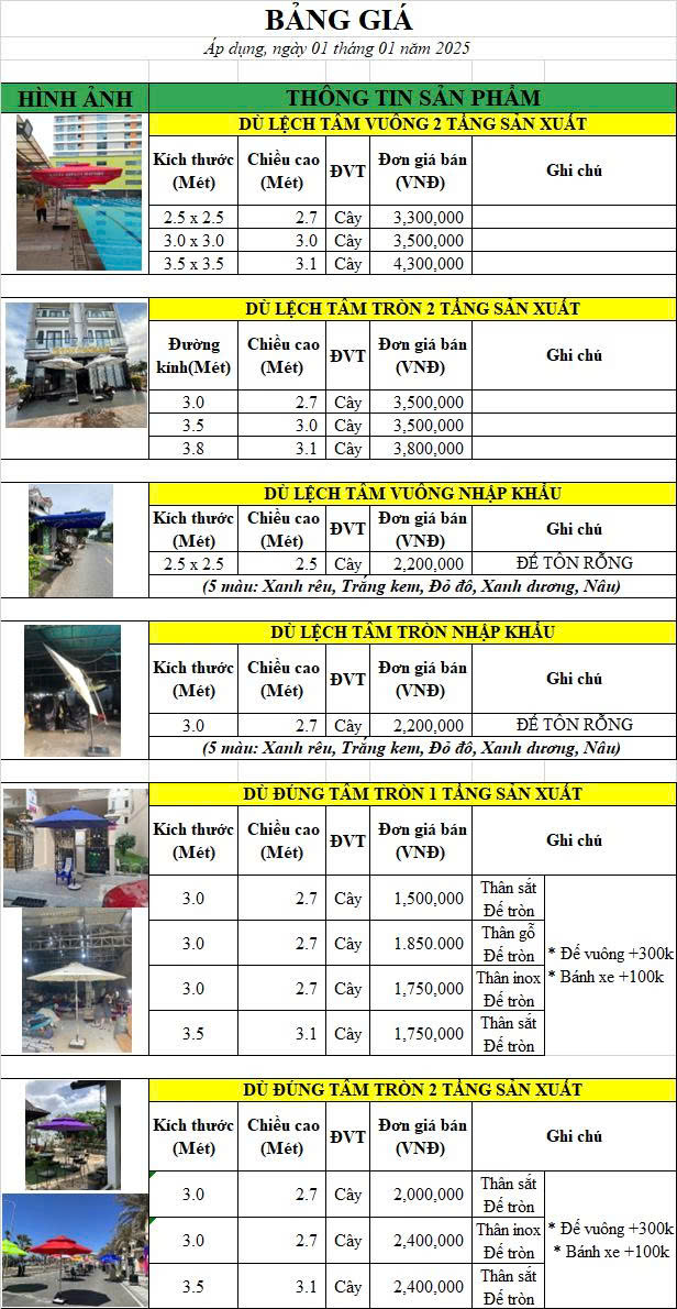 Xưởng dù cập nhật bảng giá chi tiết cho từng mẫu dù che nắng che mưa, giúp khách hàng dễ dàng so sánh và lựa chọn sản phẩm ưng ý nhất.