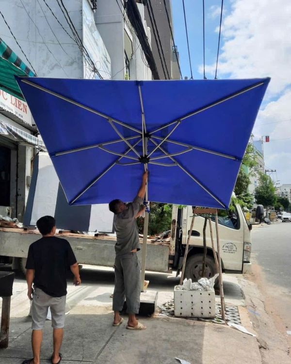 Dù dáng nghiêng vuông 2.5mx2.5m màu xanh dương đậm là lựa chọn lý tưởng cho sân vườn, quán cà phê, nhà hàng và khu nghỉ dưỡng. Gam màu xanh dương đậm sang trọng giúp không gian thêm nổi bật, vừa mang lại bóng mát dễ chịu vừa tăng tính thẩm mỹ ngoài trời.
