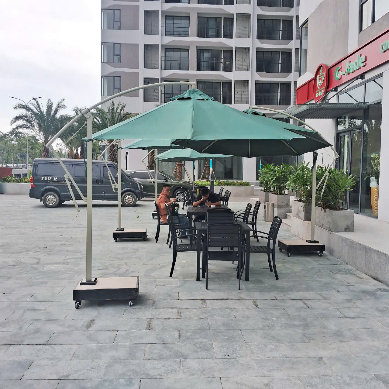 Dù lệch tâm tròn sang trọng, bền bỉ, che nắng mưa hiệu quả. Giải pháp hoàn hảo cho sân vườn, quán cà phê, nhà hàng, hồ bơi ngoài trời.